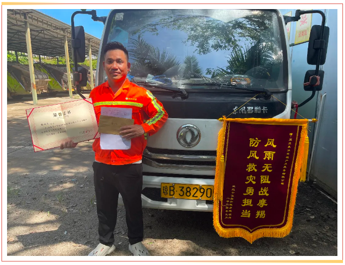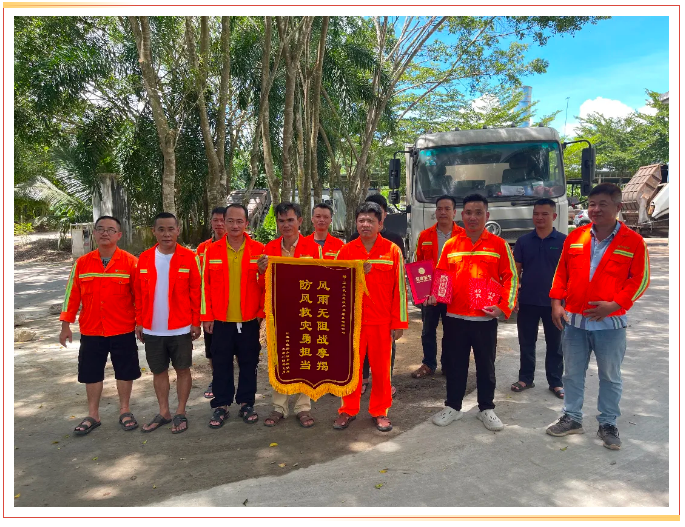 2024 年 9 月6日,文昌遭受臺(tái)風(fēng)侵襲,給當(dāng)?shù)貛?lái)了嚴(yán)重的破壞。在災(zāi)后重建的關(guān)鍵時(shí)刻,我司積極響應(yīng)號(hào)召,迅速組織陳旭、黎從文兩名特種作業(yè)車(chē)駕駛員及兩輛垃圾運(yùn)輸車(chē)投身文昌臺(tái)風(fēng)災(zāi)后重建工作。